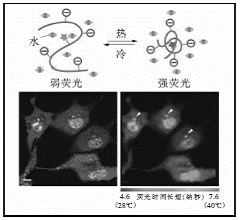 热源材料:由内山诚一实验室研发的微型荧光温度计设计图。当温度计受凉的时候,它的聚合物主干保持一种开放的结构,水分子可以急速冷却荧光单元并停止其发光(这里为一个星形基团)。当温度上升时,温度计折叠并保护荧光单元远离水,使其可以发光。温度计揭示:培养的猴子细胞的细胞核平均温度比细胞质平均温度高1℃。