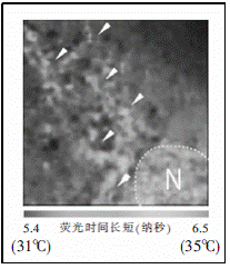 这种温度计的组成一部分是量子点群,其荧光发光性随温度的上升而被淬灭,第二部分是对温度不敏感的荧光纳米粒子群,二者都被包裹在一种被称为FDA的聚合物之内。