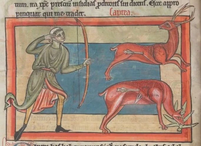 上图选自一本完成于13世纪、现藏于大英图书馆的动物寓言集Harley MS 4751,描绘了一头母鹿被猎人的箭射中后啃食白鲜草的场景。