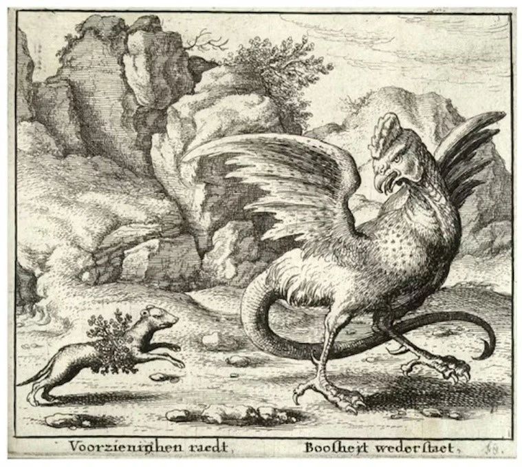 17世纪波西米亚绘画艺术家温泽尔·霍拉尔(Wenzel Hollar)为《伊索寓言》绘制的插图,描绘了一只围系着芸香环带的黄鼠狼正攻击一只蛇怪。