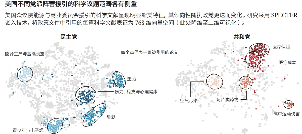 以众议院能源与商业委员会为例进行分析。如图(不同党派阵营援引的科学议题范畴各有侧重)所示,分别呈现了民主党与共和党主导时期该委员会引用的科学文献聚类分布。尽管存在部分共同关注领域,但两党控制下的文献聚类呈现显著差异。民主党主导时期,委员会更多引用关于能源生产与基础设施,青少年与电子烟,暴力、枪支与心理健康,醉驾,堕胎的科学文献;而共和党控制时期则更关注空气污染,阿片类药物,医疗成本,医疗保险及高中运动伤害等议题。当然,这些差异可能源于两党执政时的不同议程与目标取向。