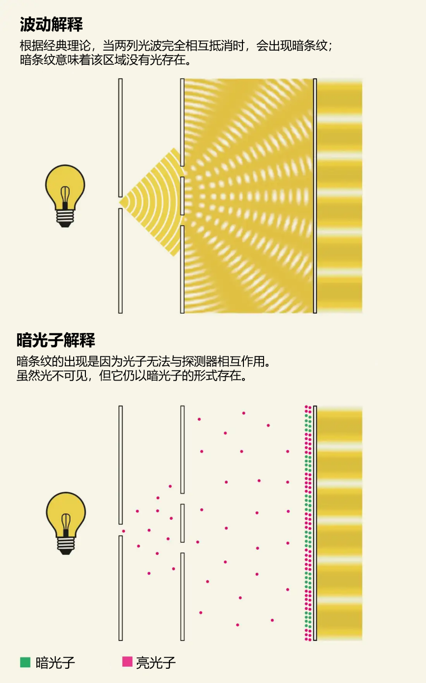 原因在于,通过狭缝的光子会在特定位置进入“暗态”(dark states),处于这种量子态下的光子无法与其他粒子相互作用,因而不会在屏幕上留下光斑。换言之,暗条纹并不代表光子(或者说光)不存在,而是部分光子具有规避探测的量子特性的体现。
