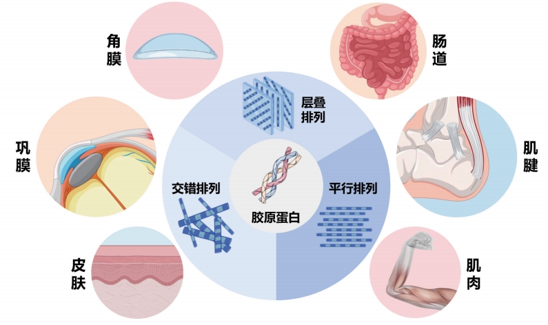 为什么我们的眼角膜晶莹剔透,而紧邻的巩膜却呈不透明的白色?这是因为,虽然它们的主要成分都是胶原蛋白,但其内部微观纤维排列方式截然不同,所以角膜高度透明而巩膜则呈现白色。类似地,平行排列的纤维赋予肌腱和肌肉强大的力学性能,而交错排列的纤维让皮肤柔软并富有弹性。由此可见,生物组织的性能很大程度上来源于其微观结构的精巧设计(图1)。微米乃至纳米尺度上的微观结构排列,往往决定了材料的宏观性能和功能。