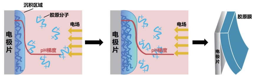 电场驱动的自组装,通俗地讲就是利用电场在分子层面进行排兵布阵。其核心方法是通过电极施加特定的电信号,使得溶液中带正电荷的天然大分子(如壳聚糖、胶原蛋白等)被吸引到带负极性的阴极上富集,并利用电极表面产生的局部化学变化诱导它们发生定向组装(图2)。具体来说,当电极通电时,阴极表面发生水解析出OH-离子,造成局部pH升高,在一定范围里形成pH梯度。带正电的生物大分子在电场力作用下朝阴极电泳迁移,当它们来到阴极表面时,周围的碱性环境使其电荷中和、溶解度降低,从而在电极上沉积、组装为水凝胶状的固体结构。通过精巧设计电流强度、信号模式等参数,该技术可以像指挥交通一样控制分子何时何地“扎堆”,由此打造出所需的微观结构。