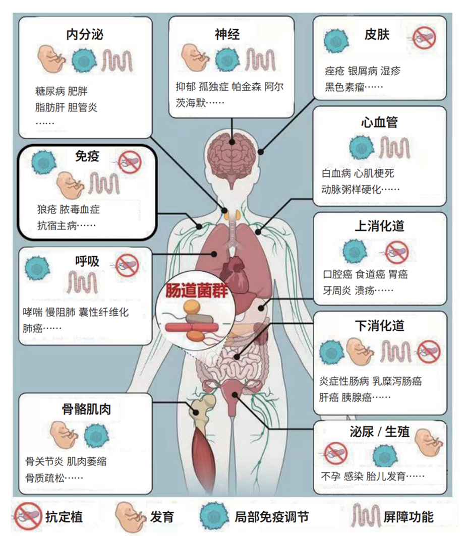 肠道菌群反映宿主的健康和生理状态,通过胞内胞外成分、代谢产物以及移位等调节人体免疫、代谢、神经系统,影响肠内外组织和器官病变风险