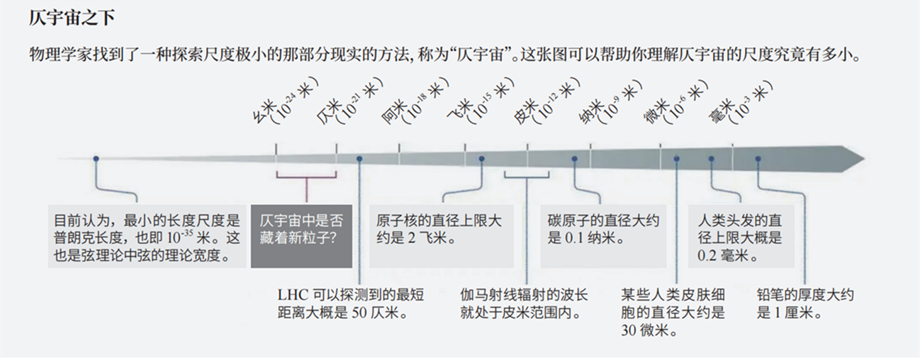 LHC能够把质子加速到接近7万亿电子伏特的高能状态,这意味着,我们能借助如此高能的粒子深入大约50仄米尺度的微观世界。这是一个小到难以想象的距离,甚至只是原子尺度的几百亿分之一(参见图“仄宇宙之下”)。问题在于,如果全新物理学的世界位于LHC分辨率极限之下,那么我们就发现不了——至少不能仅凭LHC直接发现。