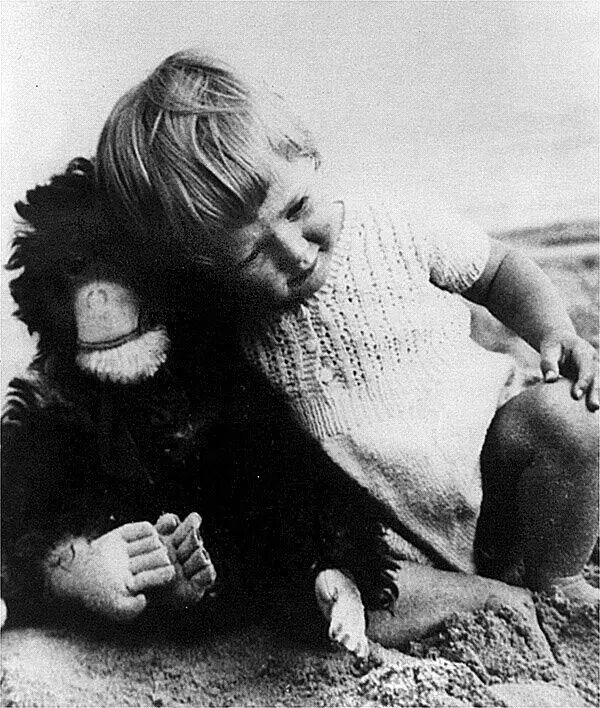 幼年古道尔正怀抱由父亲所赠的绒毛猴玩偶