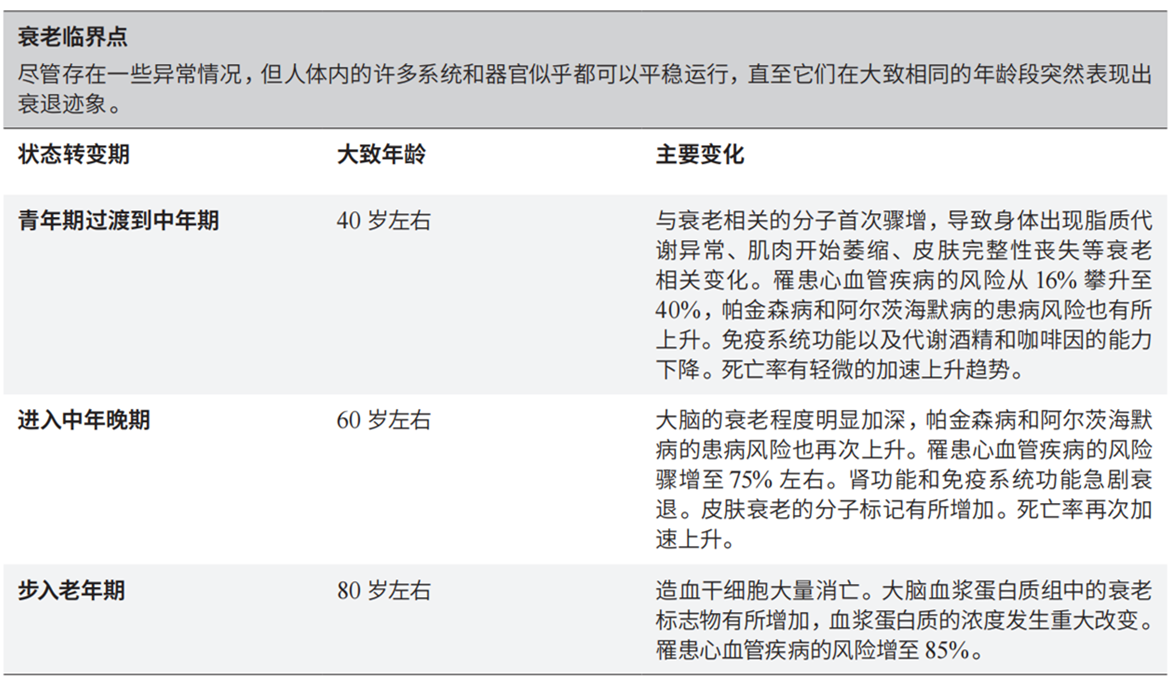 若将所有衰老临界点整合来看(同时考虑皮肤衰老等异常情况),我们似乎在进入“成熟期”后会经历多个以20年为周期的人生阶段。我们通常将这些阶段称为青年期、中年早期、中年晚期和老年期(见“衰老临界点”表)。研究表明,这些阶段的划分对应着具有鲜明生物学特征的真实生命阶段。奥莱卡指出:“虽然还需要更多数据来支撑这一观点,但据我观察,人类最重要的衰老转折点出现在40岁、60岁和80岁左右。”