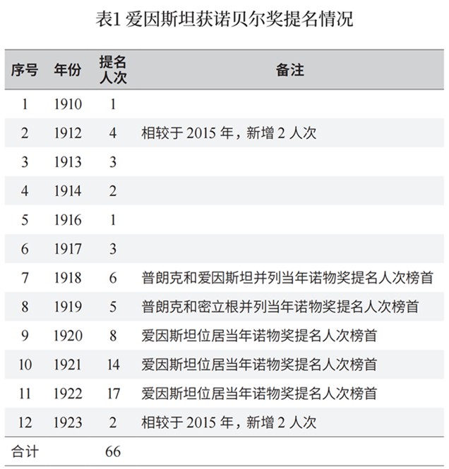根据最新的诺奖官网提名数据库统计,爱因斯坦在12个年度内共获66人次诺物奖提名,详见表1,推荐理由大多是基于他对相对论(特别是广义相对论)的原创性贡献。相较于2015年的统计数据,新增4人次系重新整理档案资料时的新发现(或原来认定为无效提名后被重新判定为有效提名)。