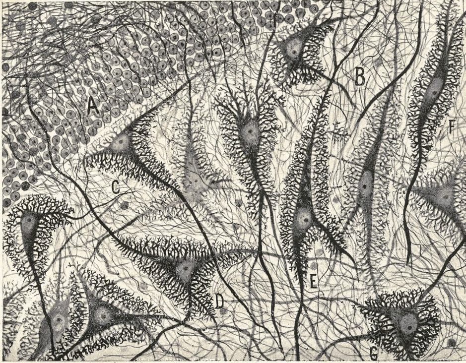19世纪末20世纪初,神经解剖学家圣地亚哥 · 拉蒙-卡哈尔(Santiago Ramón y Cajal)的笔下诞生了很多关于分支、螺旋、棘突与网状结构的手绘作品。这些作品如今闻名于世,首次揭示了哺乳动物大脑基本构建单元(我们称之为神经元)的独特性与多样性。