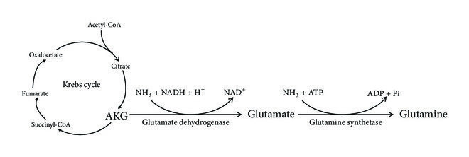 三羧酸循环/克雷布斯循环里的中间代谢物AKG转化为谷氨酸(Glutamate)和谷氨酰胺(Glutamine)