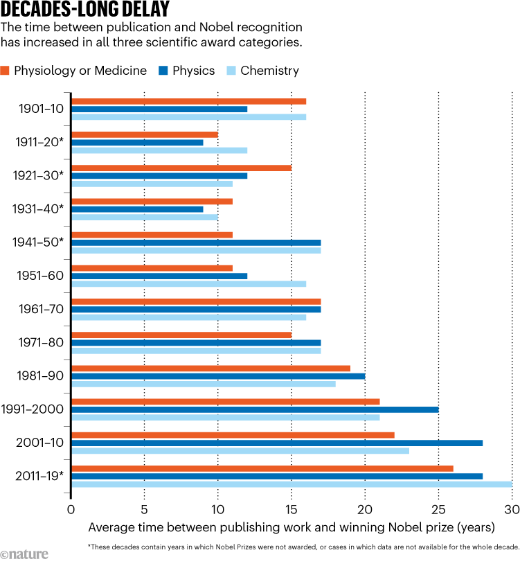 在过去的60年里,从发表论文到获得科学奖的平均时间几乎翻了一番。在三个科学奖中,化学奖的“诺贝尔奖滞后”最长——过去10年平均为30年——而生理学或医学奖的滞后相对短,为26年。