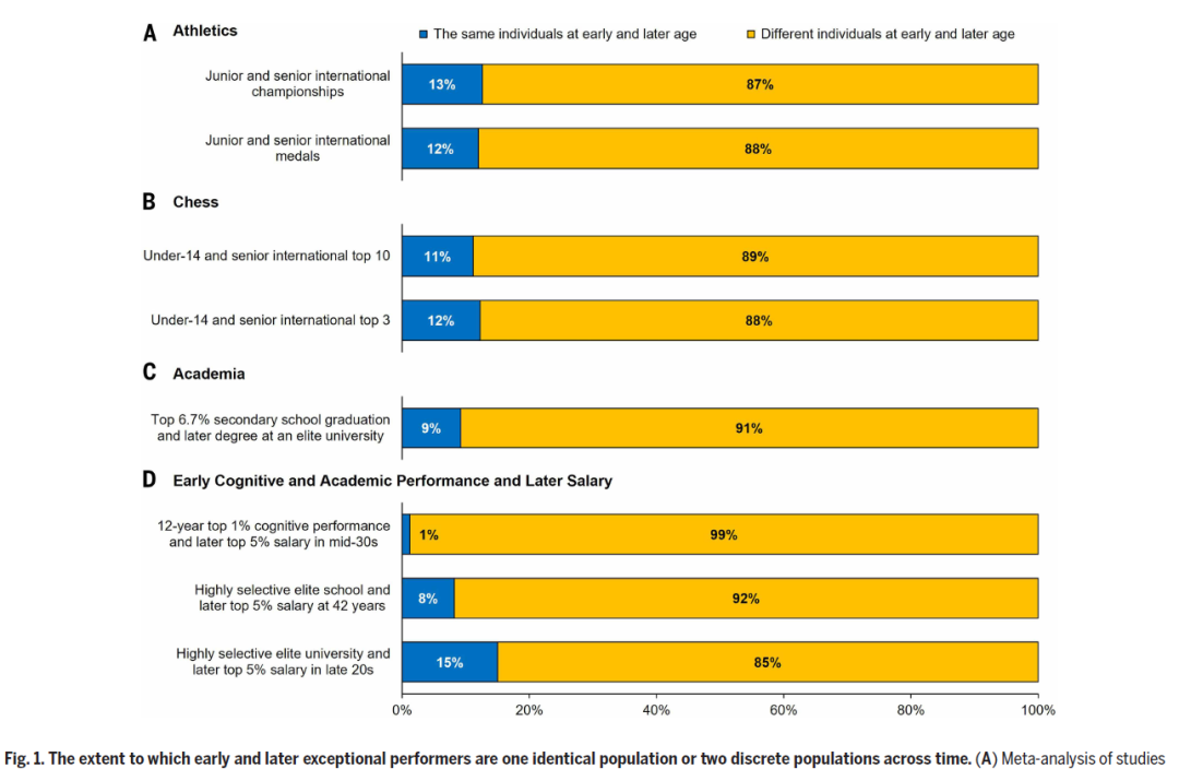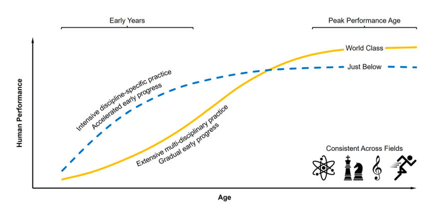 该文通过研究发现,最终达到世界顶尖水平的成功大师,在青少年时期往往并不是表现最拔尖的那批“神童”。相反,那些在30~35岁做出重大创新的人,通常在早期参与了更多的跨学科实践,而非过早地在单一领域进行枯燥的重复训练。(参见:Science :大师大多不曾为神童 …… 神童滤镜被打破?)