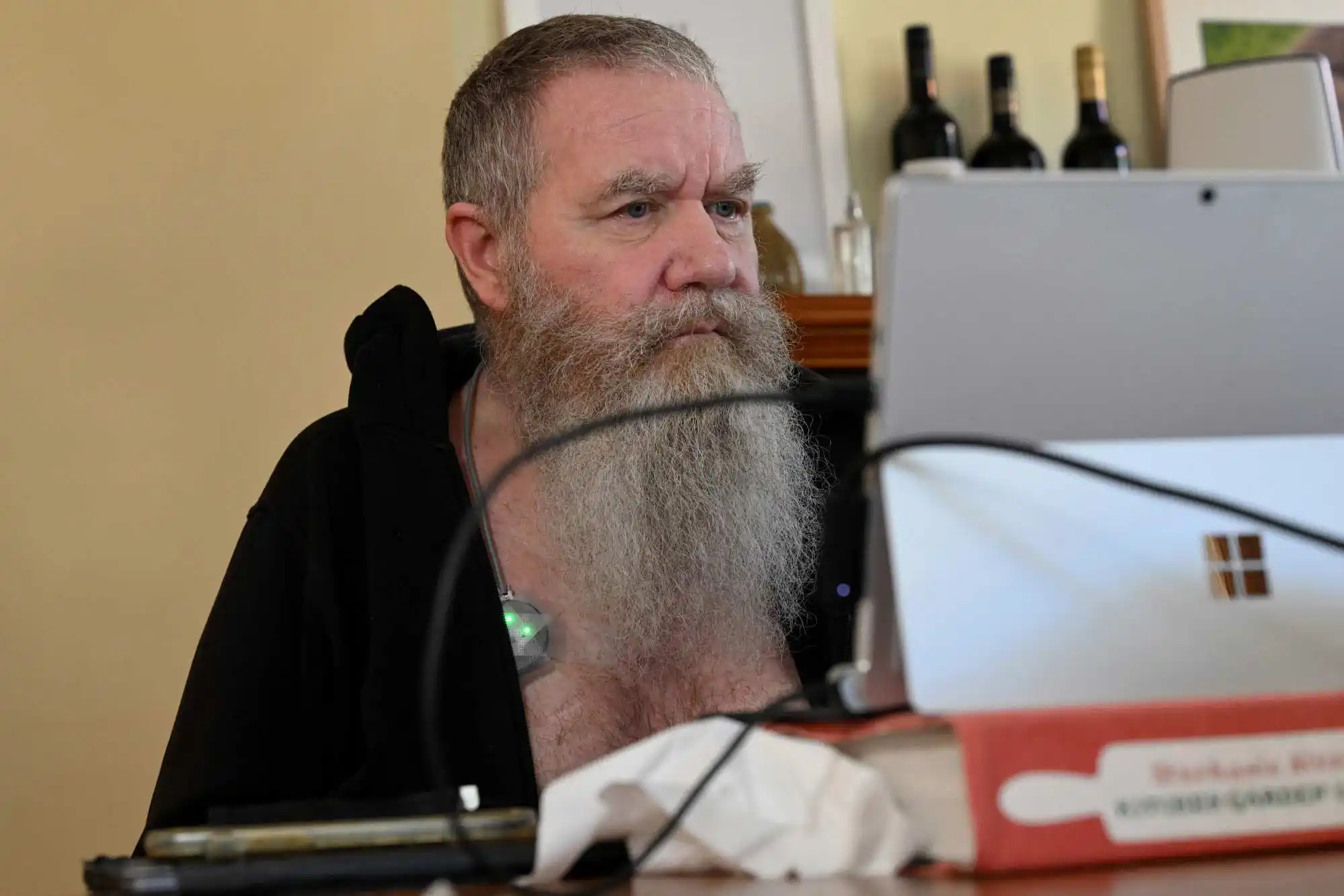 2020年12月,戈勒姆在澳大利亚参与临床试验,完成设备植入。上图拍摄于2023年8月,戈勒姆正在墨尔本的家中运用意念操作电脑